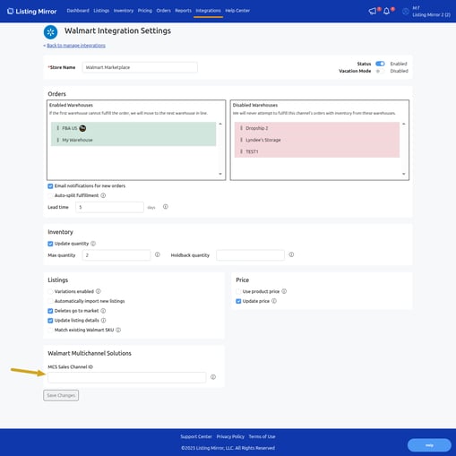 If you don’t know where to find your MCS Sales Channel ID or don't yet have one, Walmart has a guide that walks you through it. If you need to create an ID, simply create your own under the name "Listing Mirror". You will only need one no matter what how many channels you route to Walmart WFS via Listing Mirror.